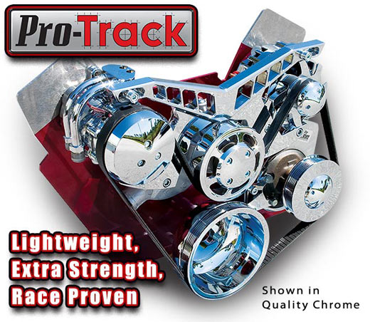 Lightweight, Extra Strength, Race Proven For the Performance oriented engine builder March Performance’s new All Billet Aluminum Pro-Track serpentine system is just the ticket. This 1” thick one-piece alternator and air conditioning bracket is not only strong, but light.