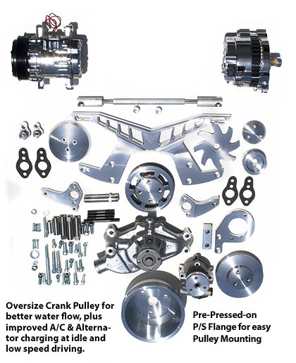 A separate bracket allows the option of remote or canister style power steering or no power steering. Pro-Track makes use a unique easy to use belt tension adjustment tool. Once the belt tension has been set, the adjustment tool is easily removed and stowed away until the next time the belt requires adjustment. As a result, the Pro-Track displays a much cleaner appearance. For the ultimate in convenience an optional spring loaded tensioner is available.